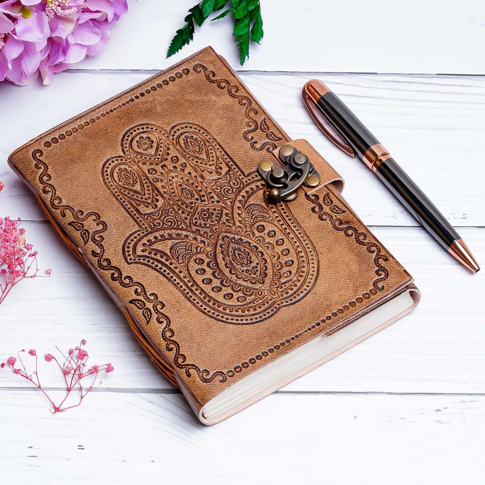 vintage handmade leather journal. Crafted with genuine leather, it radiates authenticity and charm, perfect for those who appreciate classic craftsmanship. The premium antique lock closure adds a touch of elegance and security, ensuring your thoughts and memories are safeguarded within its pages. Inside, you’ll discover 200 White handmade pages, providing ample space for your musings, sketches, and stories to unfold. Whether it’s for journaling, sketching, or planning, this versatile journal is a timeless companion for your creative endeavors. Treat yourself or a loved one to this exquisite piece, a celebration of tradition and creativity